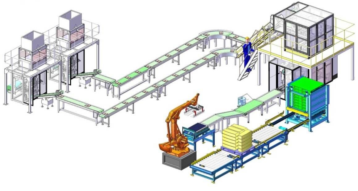 C. 일반적으로 포장 및 팔레타이징 라인에는 다음이 포함됩니다: 전기 캐비닛, 재봉틀, 재봉 컨베이어, 백 푸시 기계, 컨베이어 재형성, 금속 탐지기, 중량 검사기, 백 리젝터, 잉크젯 프린터 컨베이어, 잉크젯 프린터, 팔레트 매거진, 팔레타이징 컨베이어, 로봇, 포장기, 팔레타이징 컨베이어 완성.